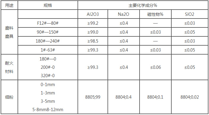 白剛玉以工業(yè)氧化鋁粉為原料,于電弧中經(jīng)2000度以上高溫熔煉后冷卻制成,經(jīng)粉碎整形,磁選去鐵,篩分成多種粒度,其質地致密、硬度高,粒形成尖角狀,適用于制造陶 瓷、樹脂固結磨具以及研磨、拋光、噴砂、精密鑄造(精鑄專用剛玉)等,還可用于制造耐火材料 。